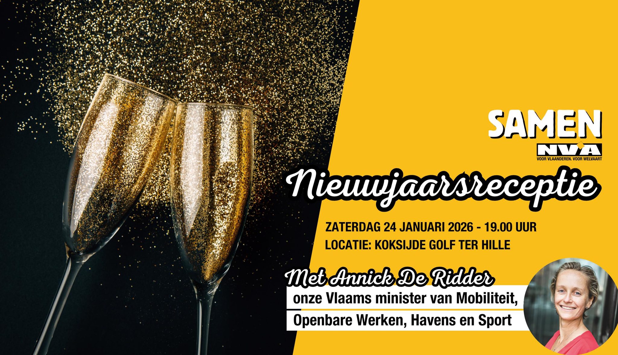 Welkom op onze 'Samen N-VA' Nieuwjaarsreceptie op zaterdag 24 januari 2026 vanaf 19.00 uur in Koksijde Golf ter Hille!
