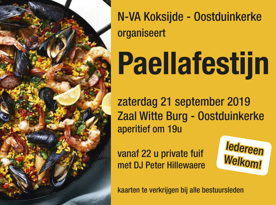 N-VA Koksijde-Oostduinkerke organiseert op zaterdag 21 september een niet te missen paellafestijn. Naar jaarlijks traditie voorzien we na de paella nog een feestje met DJ Peter Hillewaere. Aperitief om 19u in zaal De Witte Burg te Oostduinkerke.
